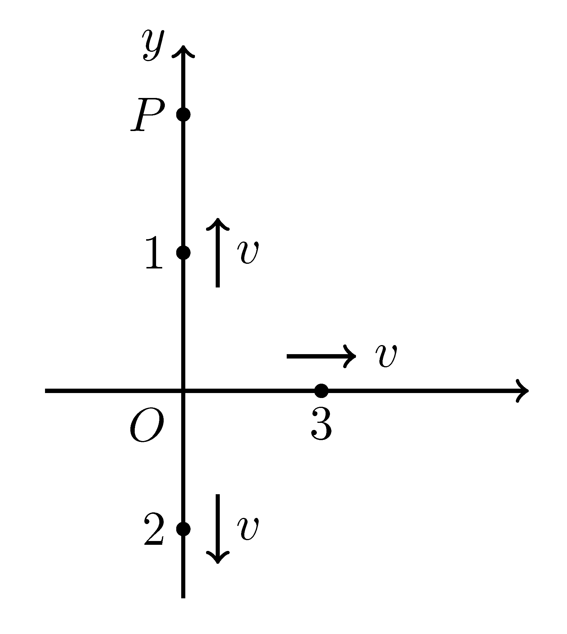 惯性系 S 中三艘已处于匀速直线运动状态的飞船 1,2,3,各自的速度大小同为 v,航向已在图中标出。某时刻三艘飞船“相聚”(彼此靠近,但不相碰)与 S 系的 O 点。此时各自时钟都校准在零点。飞船 1 到达图中与 O 点相距 l 的 P 处时,发出两束无线电信号。而后分别被飞船 2,3 接受到。