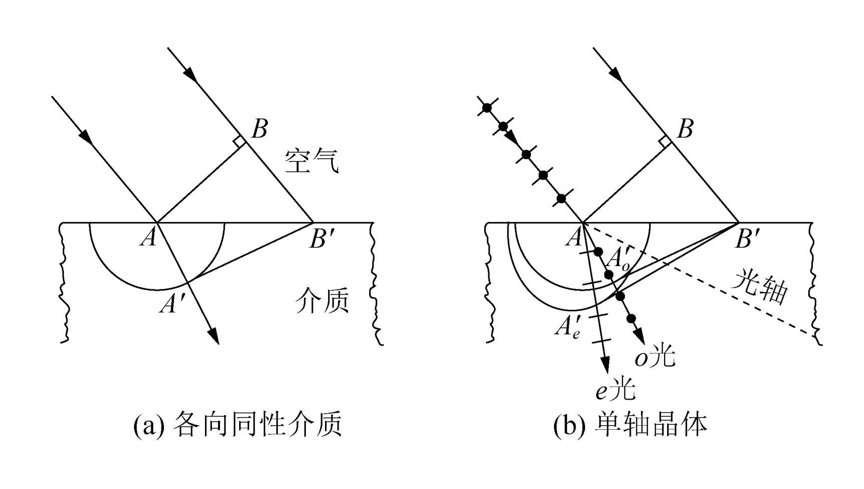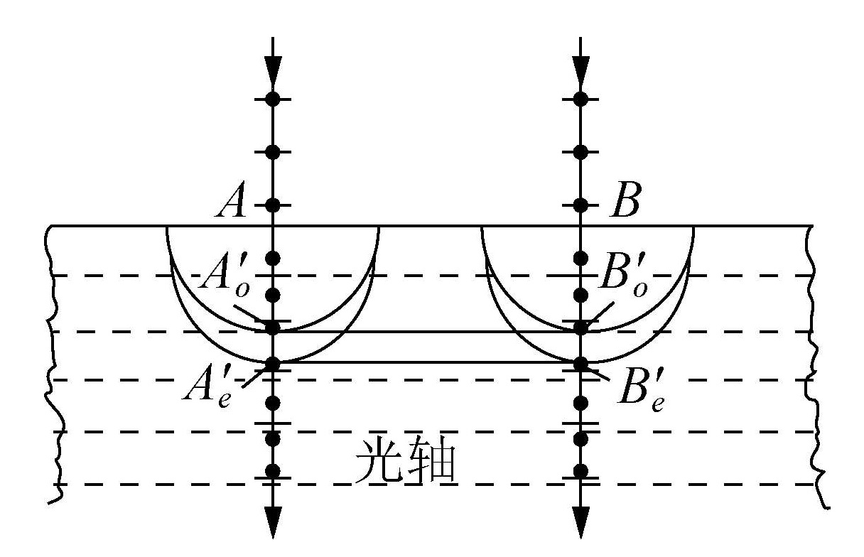 - 以 A 为中心,vot 为半径,在折射介质内作半圆,这就是另一边缘入射线到达 B′ 点时由 A 点发出的 o 光次波面。再作一个与它在光轴方向上相切的半椭球面,其另外的半主轴长为 vet,这就是 e 光的次波面。