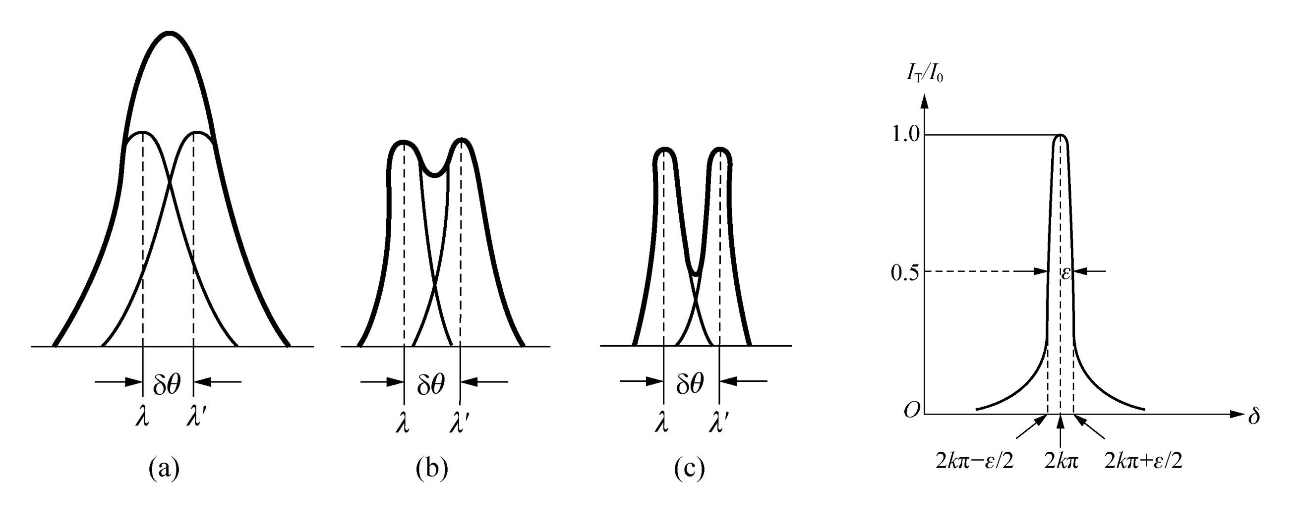 其中 ε \varepsilon ε 为相位半值宽度。两条相差 δ λ \delta \lambda δ λ 的谱线 k k k 级亮纹之间的角距离 δ i k \delta i_k δ i k 为