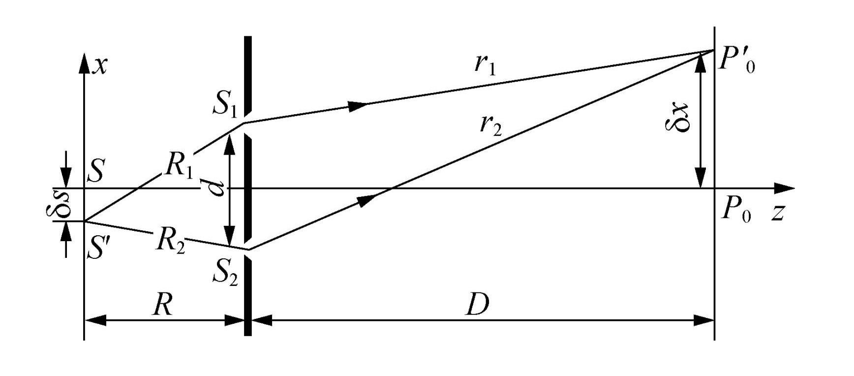 条纹位移与点源位移的关系为 δx=RDδs,移动方向相反,如图所示。
