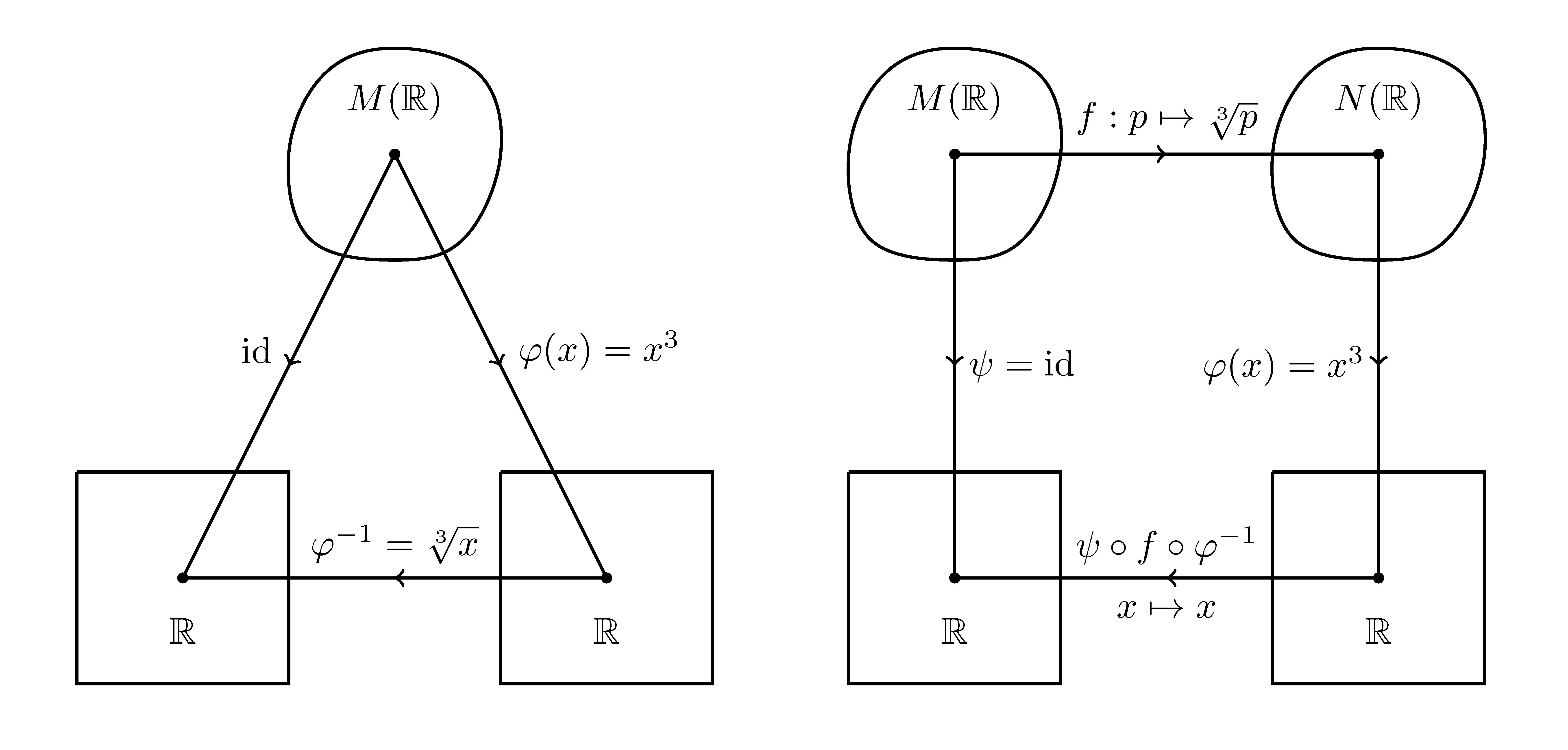 如图所示,坐标转换映射 ψ ∘ f ∘ φ − 1 : R → R \psi \circ f \circ \varphi^{-1}: \mathbb{R} \to \mathbb{R} ψ ∘ f ∘ φ − 1 : R → R 为 ψ ∘ f ∘ φ − 1 : x ↦ x \psi \circ f \circ \varphi^{-1}: x \mapsto x ψ ∘ f ∘ φ − 1 : x ↦ x ,此映射显然是 C ∞ C^\infty C ∞ 的,因此是微分同胚。