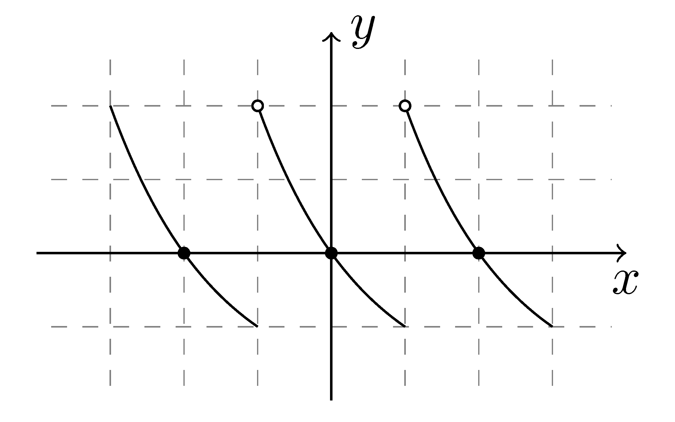 如图所示,实心点为周期间断函数真正的零点,而空心点为间断点。预搜索二分法固然能判断并找到实心点作为零点,但在空心点两侧函数异号,预搜索认为此处也存在一个零点。无论二分区间 ( a , b ) (a,b) ( a , b ) 的长度 ∣ a − b ∣ |a-b| ∣ a − b ∣ 怎样逼近给定的 ε \varepsilon ε ,区间两侧总是异号,陷入死循环。