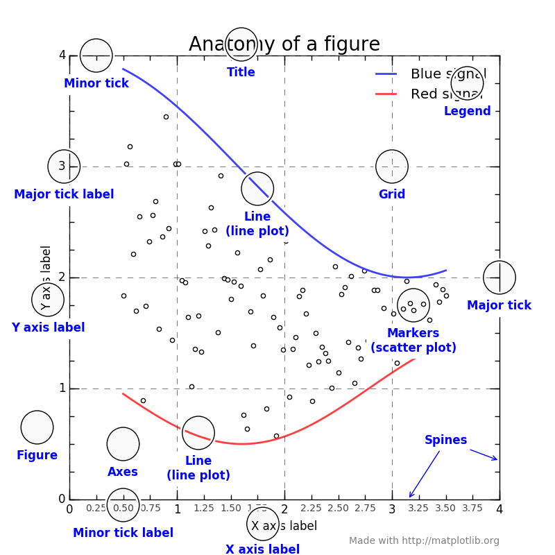 - Axes:图中的一个独立坐标系。我们在其中绘制曲线、刻度、标题、图例等。