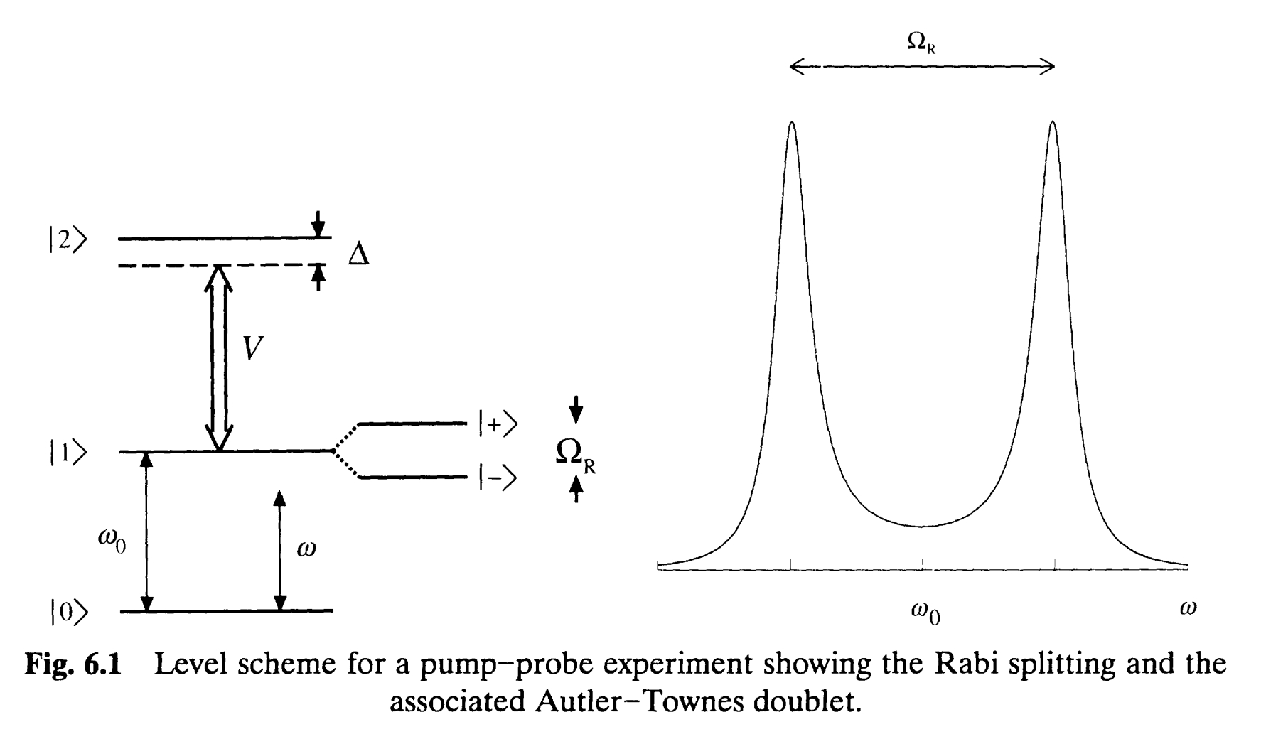 Now we apply a second weaker laser to probe the transition between the state ∣0⟩ and the state ∣1⟩. As the frequency of the probe laser is swept through resonance with the bare transition frequency ω0, the absorption spectrum obtained exhibits two peaks separated by the generalized Rabi frequency Ω associated with transitions between the bare states ∣1⟩ and ∣2⟩, as shown in the following figure. The positions of these peaks differ from the bare transition frequency ω0 by ±Ω/2. In other words, the weaker laser actually detected the transition of ∣0⟩↔∣+⟩ and ∣0⟩↔∣−⟩!
