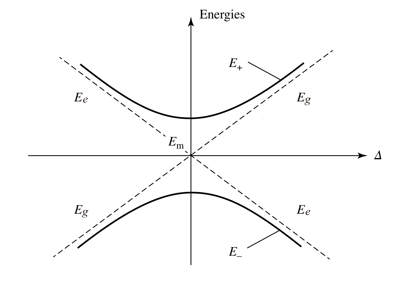Therefore, when ω≪ω0 (blue detune), we have Eg≈E−<0 and Ee≈E+>0. While when ω≫ω0 (red detune), we have Ee≈E−<0 and Eg≈E+>0. Now, to perform adiabatic population transfer, we adjust the laser gradually and slowly from blue detune to red detune. Assume the atom was initially at ∣g⟩, and the laser is blued detuned, thus ∣g⟩∼∣−⟩. In the process of adjusting ω0, due to the adiabatic theorem, the atom will remain in the state ∣−⟩. However, when the adjustment ended, we find that ∣−⟩ sims ∣e⟩ now! The population transfers from ∣g⟩ to ∣e⟩.