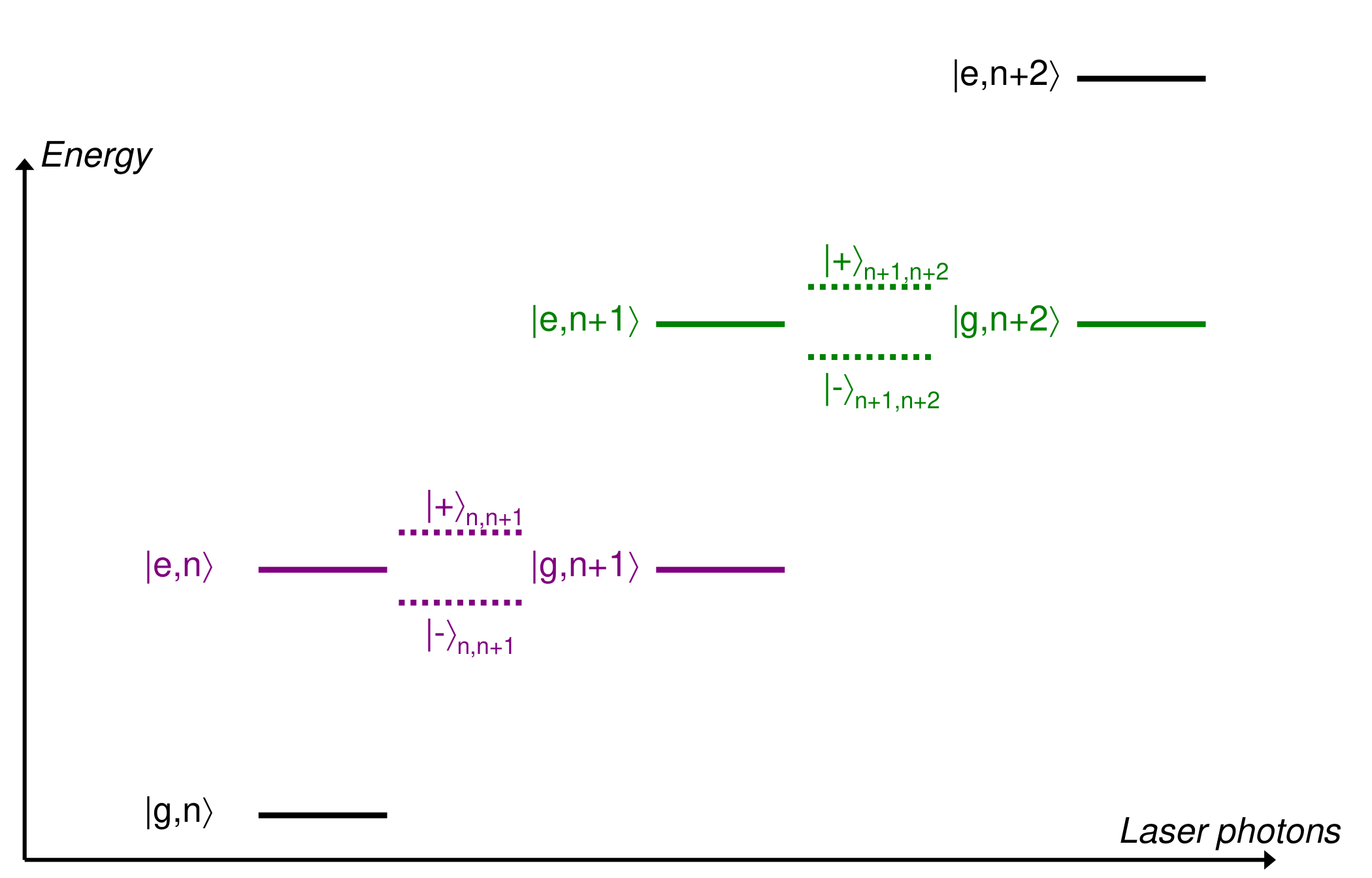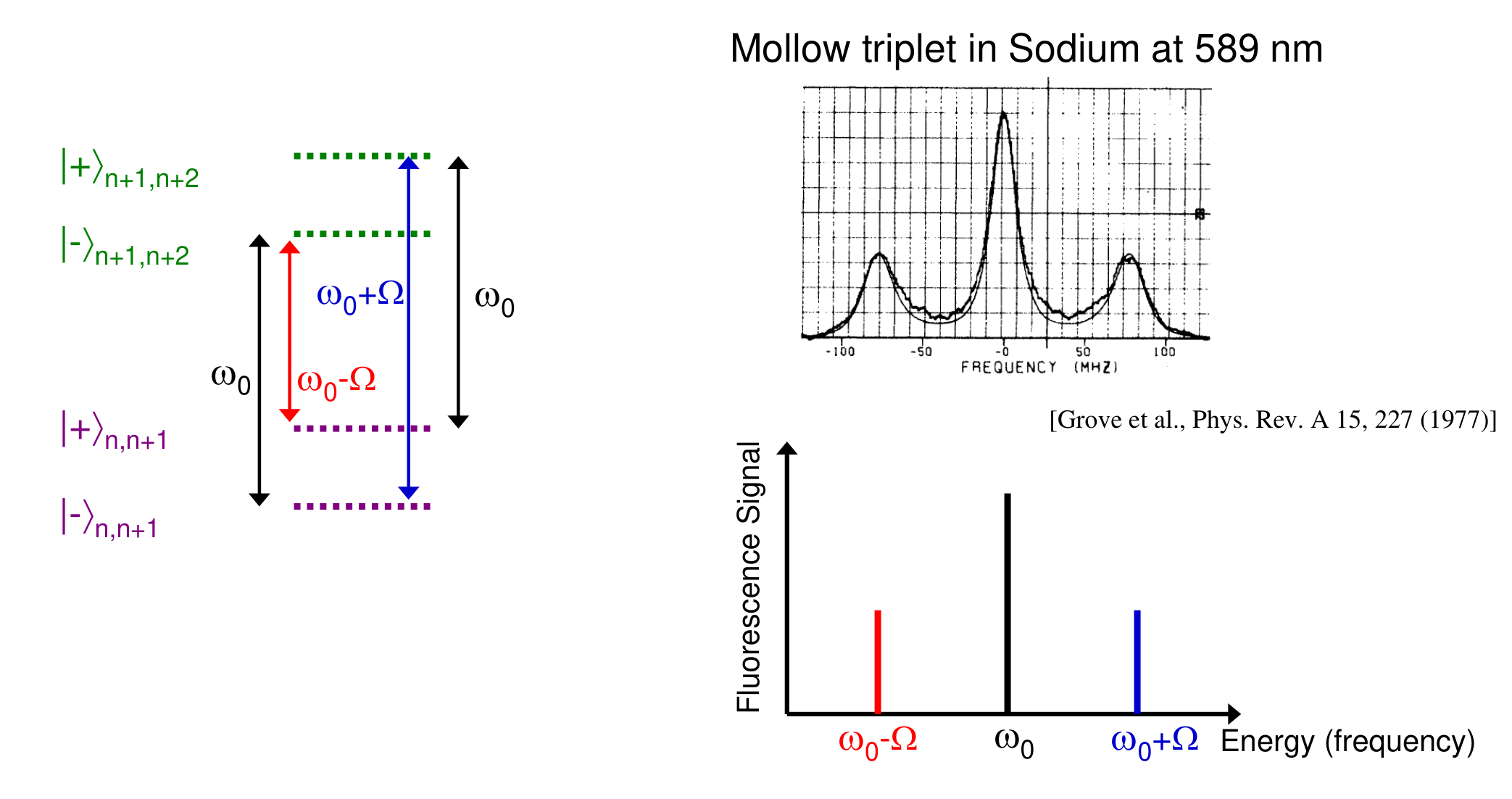 Mollow Triplet is the fluorescence spectrum when an atom is strongly driven by a laser. Due to the dipole interaction derived above, the atom-field system forms pairs of dressed states